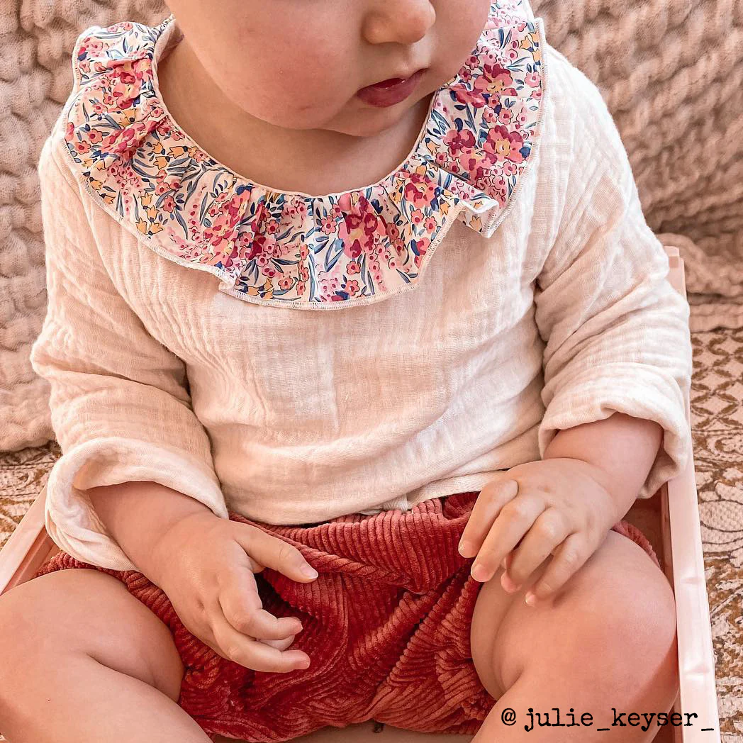 La blouse se porte avec un bloomer, un legging ou pantalon ou sous une robe ou salopette.